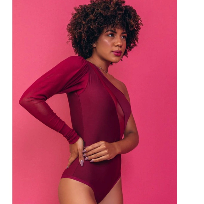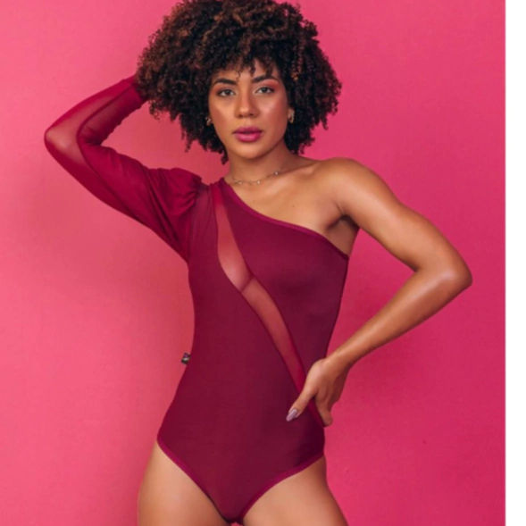 Confeccionado em microfibra, o body apresenta um decote diagonal com detalhes em tule, valorizando o colo de forma delicada e sensual. Com um ombro só e manga toda em tule, o modelo é extremamente moderno e fashion, agregando personalidade ao visual.